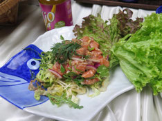その他の野菜は薄切りにして、全てをボールに入れよく混ぜる。そこへレモン汁、醤油、ワサビ、イジオ4(またはイジオ4オリーブ)を加えタレを作る。