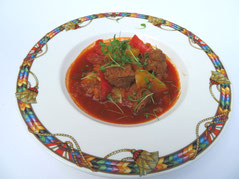 ロシアを南北に縦断するウラル山脈地帯の西アジアに、牧畜を生業とする遊牧民が5世紀ごろ出現。騎馬技術に優れた彼らはステップ平原を自由自在に横断し、肉、毛皮の交易で生活していました。牛飼いたちは長旅に堪えない弱い牛をとさつして、たき火にかけた大鍋で、ありわせの野菜と共にごった煮にして全員の食事としていました。グーラッシュは、釜で煮た料理「釜煮グヤーシュbogrács gulyás」が起源です。現在でもハンガリーの農村ではこの伝統的なスタイルのグーラッシュを食べています。釜で大胆に煮た料理なので、うるさい規則なんてありません。肉と玉ねぎとパプリカパウダーさえあればできる男性向きの料理といえます。