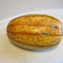 大きく分けて、サマースカッシュ(ズッキーニなどの若い状態で収穫されるもの)とウインタースカッシュ(バターナッツスカッシュ、日本カボチャなど完熟してから収穫するもの)があります。ウインタースカッシュであるカボチャには、日本カボチャ、西洋カボチャ、ペポカボチャ、ミクスタがあり、今回ご紹介するスパゲッティ・スカッシュは、ペポカボチャの仲間で、19世紀末に中国から日本に導入され、日本語では金糸ウリ(なますウリ、そうめんカボチャ)と呼ばれています。特徴は他のスカッシュと異なり、果肉を加熱するとスパゲッティの様に太い糸状になりバラバラとほぐれることです。