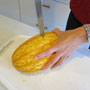 ①皮にナイフの先で数ヶ所キズをつけターンテーブルへ。