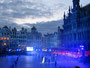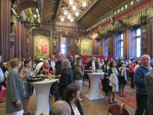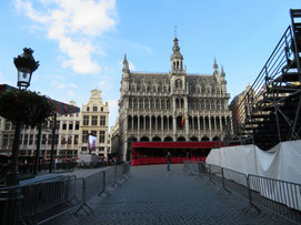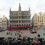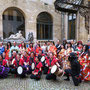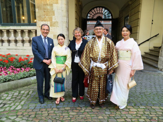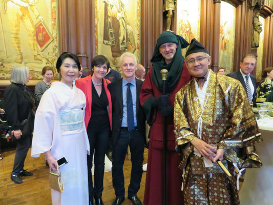 オープニングに先立ち市庁舎のゴシックの間でレセプションがあり、ブリュッセル市長と日本大使の挨拶後、関係者や招待客との和やかな懇談がありました。日本人の行列を正面から撮るつもりの私は、折からの寒さと、なにしろひな壇に座ると3時間は席を立てないので化粧室に行ったのですが、これが失敗のもと。長蛇の列で40分も待たされたせいで、太鼓の音と共に日本の行列がスタートしてしまいました。急きょ一分だけと頼み込んで、市庁舎のバルコニーから行列の写真を撮ったのでボケていますがご勘弁を。なお、石井大使がお召しになったのは16世紀の武家の正式装束で「直垂(ひたたれ)」というそうです。鎧兜を着た人、打掛を羽織った女性、町人姿の人、そしてなんと忍者まで登場。おおいにカメラが向けられました。