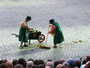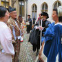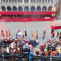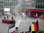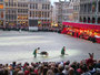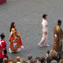 繰り広げられる時代絵巻は何回見ても迫力ありですが、みんなの笑いをさそったのが、馬にまたがった騎士たちが登場した後、馬が残したものを掃除するために登場した掃除夫の二人。モップとシャベル片手に手押し車で現れ、セッセと馬糞をかき集め、爆笑と拍手で見送られながら退場。ところが次々に登場する騎士たちで、広場のあちこちに馬糞が残され、しかしプログラムは進行するはで、どうなることかとハラハラしました。そこをうまくよけて練り歩く人、ドレスの裾をしっかり持ち上げて歩く貴婦人、気がつかないのか胸をはって堂々とその上を歩く司祭、馬まで滑りかける始末で、あまりのおかしさに涙を流しながら笑いころげた不謹慎な私でした。