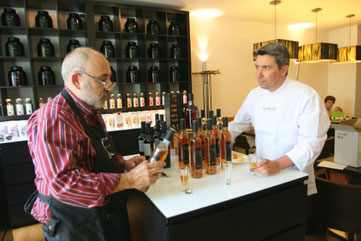 リエージュの東方、ヴェルヴィエに本店があるパティスリー「ダルシ」で、新作マカロンとパティスリーに合う甘口ワインの試飲会が行われた。ワインはフランス・ラングドック南部のコルビエール産。この一帯はゴツゴツした岩石の丘陵と地中海に挟まれ、雨量が極端に少なく、ピレネー山脈を越える北風が一年中吹き荒れるという厳しい自然条件の地方だ。Mas Delmansのブドウ畑での仕事はほとんど手仕事で行われ、ワインはビオ栽培(オーガニック)が主体で、2014年には完全にビオに移行する。数々の賞を受賞している。