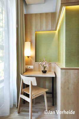 日本の伝統とモダンさが巧みにマッチした上品な客室や椅子とテーブルなどの家具は、新進気鋭のインテリアデザイナー、ジュン・ゴブロン氏(Jun Gobron)作だ。