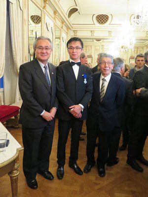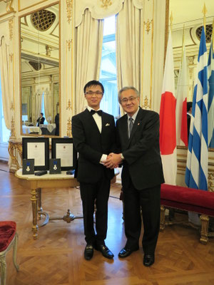 12月11日エグモン宮でその授与式があり、日本国石井大使をはじめ、その師である和食レストラン「のんべえ大学NonbeDaigaku」のオーナーシェフの末次庸介氏、家族、開店当初からの良き右腕の後藤剛司氏等の見守る中、外務大臣から章を授かった。尚、同時に授与したのは、イタリア、フレンチ(ブラッスリー)、ギリシャ料理のオーナーやシェフ達だった。
