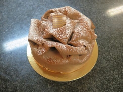 ② 直径26センチのセルクルに①のスポンジを1枚敷き、[ B ]のチョコレートムースを絞り袋で渦巻き状に絞り出す。その上に2枚目のスポンジをのせる。上から軽く押さえる。
