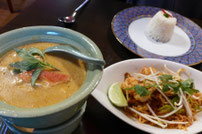 今回は2人で訪れ、前菜にPeek Kai Yad Sai(ひき肉と春雨のスパイシーな詰め物入り鶏の手羽先)、メインにPad Thai Khug Sod(タイ風海老焼きそば)とKhaeng Kai -Moo-(鶏肉または豚肉または魚入りたけのこのレッドカレー)を注文しました。席からは、タイ人女性2人がてきぱきと料理を作っている厨房の様子が見えました。