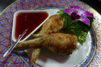 Peek Kai Yad Sai(ひき肉と春雨のスパイシーな詰め物入り鶏の手羽先)は、そのままでも、スイートチリソースをつけても美味。素敵なお皿に花も添えて盛り付けられていて、綺麗で見ても楽しめます。