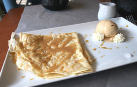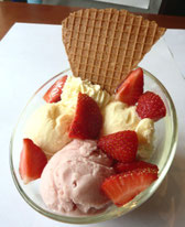 ステェファンがチョコレートと同じぐらいに情熱を持つのがアイスクリーム。目標としたのがイタリアの伝統的ジェラート作り。本場に出かけて研究を重ねたアイスクリームは、農家から直接届く新鮮な牛乳と生クリーム(脂肪分40%以上)、砂糖、ブドウの種の砂糖、イナゴマメのゴムをベースに、自然の素材を使ってバニラやチョコレートを始め、ゲランドの塩入りキャラメル、スペキュロース等、30種類におよぶ風味があります。さっぱりしていて且つコクがあり、口どけが最高に滑らかなアイスクリーム。本場のイタリアをはるかにしのぐ美味しさです。また果物を50%使ったシャーベットはまるで果物を食べているよう。マンゴーやベルギー特産のキューベルドンが彼のお勧め。秋からは自家製のゴーフルやクレープも楽しめます。
