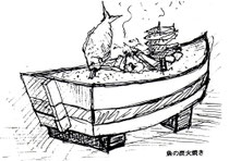 砂を縁までいっぱいに盛って平にした古い木造のボートの上に火を熾して、魚を串刺しにして火の回りにかざして焼くのだが、ある店の焼き場担当のお兄さんがすご~くきれい好きのようで、調理台の上の串は縦横にキッチリ並べられ、もちろん台の上の皿は鱗の一つさえついていない。私たちが通りかかったときにはボートの下に水を打ってブラシで掃除をしていたくらいだ。しかし、黙々と仕事をしていたお兄さんも、私たちの姿を見ると大きな声で手振りを交えてにこやかに話しかけてくる。“おいしいよ!ここで食べていきなよ、日本人だから魚好きだろ!!”とでも言っていたのかもしれないが、そういう彼の打って変わったけたたましさを見て、「あ~やぱりラテン系だったね~。」と私達は顔を見合せて笑い、このレストランに入ることに決めたのだった。
