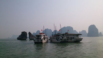 ハロン湾では、クルーズ船に乗り魚介料理を食べながら遊覧しました。船が出港すると直に、ここで水上生活をする漁師が小舟に乗って近寄ってきました。小舟をクルーズ船に横付けして、大きなタライを運び入れました。なんと、生きたカニ、シャコ、ハマグリを売りに来たのです。船上で買った魚介はて船のキッチンで調理してくれます。海上で食べる新鮮な魚介は美しい景色がプラスとなり最高の醍醐味でした。お値段?もちろん観光客料金(ハノイの市場価格の45倍)でした。