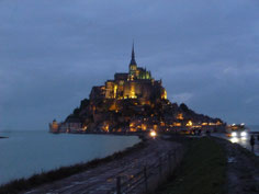 日が沈み、辺りがだんだんと暗闇に覆われはじめるころ、静寂に包まれたモン・サン・ミッシェルはとても幻想的です。修道院や店に明かりが灯り、遠くから眺める島は全体が一つの建造物のようにも見えます。潮が満ちたモン・サン・ミッシェルは一段と美しく、時を忘れてしばし見入ってしまいました。