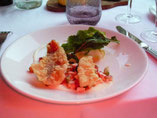 夕食はトマト料理で有名な一つ星クリスチアン・エチエンヌ“Christian Etienne”。テラスをテントで覆った部屋にはトマトの鉢もテーブルのそばにあり、まるで温室の中で食べている気分です。注文したのは“Menu Tomates”70。グラスに入ったガスパチョに始まり、トマトの名前も”Roma”や、”Couer de bouf”と珍しいものばかり。飾りつけもおしゃれで、山椒が使われていたりと、楽しい驚きの料理のオンパレード。なかでも気に入りは緑と赤の生のトマトのバジリコ風味の前菜、”Tartare de tomates’Ananas et Green zebra’au basilica,salade d’ete,crispy tomate“。シマウマという名前のトマトは疲れを吹き飛ばすおいしさでした。