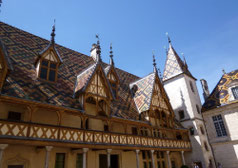 Hotel- Dieu)へ。ブルゴーニュ地方独特の幾何学模様のきれいなスレートの屋根に目を奪われ、裕福な役人夫妻が貧しい人のために15世紀に作った建物の豪華さに感心しました。