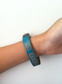 学校という親の目から離れたところで、こどもが自分の身を守らなければならないというのは、まだ小さくてうまくいいたいことを伝えられないこどもには難しいものです。まして外国語で伝えなければならない・・・そこで、入学するにあたって苦肉の策で身に着けさせたのが皮革製のブレスレット。アメリカの学校ではブレスレットやネックレス程度なら男の子も女の子も身につけていてもとがめられることはあまりありません。そのため、テーマパークで見つけた名前を入れてくれる皮革製品のショップで、あえて「No EGGS」とでかでかと彫ってもらって毎日つけさせることにしました。英語をほとんど知らずに渡米した子どもに一番大事な「Bathroom(トイレ)」という言葉の次に覚えさせたのが「Egg(卵)」と「Allergy(アレルギー)」。そしてうちの子のブレスレットを目にして「何それ?」というクラスメートに、我が子は一言「卵アレルギー!」と答え続け、あっという間に新しく来た日本人の子はアレルギー持ちであるということが浸透したのでした。「○○は卵アレルギーだから私も卵をお弁当にもっていかないよ!」とお母さんに伝えるお友達も現れました。私は、隣で卵を食べてもいいんだよと伝えつつも、みんなでわが子を守ってくれるようになったのは想定外のうれしいことでした。